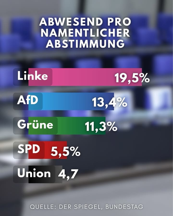 So fehlte die AfD-Fraktionsvorsitzende Alice Weidel an 17 Sitzungstagen und nahm nicht an 15 Abstimmungen teil, ohne dass dafür konkrete Gründe genannt wurden.